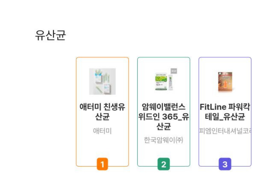 | 구분 | 애터미 친생유산균 | 암웨이 뉴트리라이트 밸런스 위드인 | 핏라인 파워칵테일 |