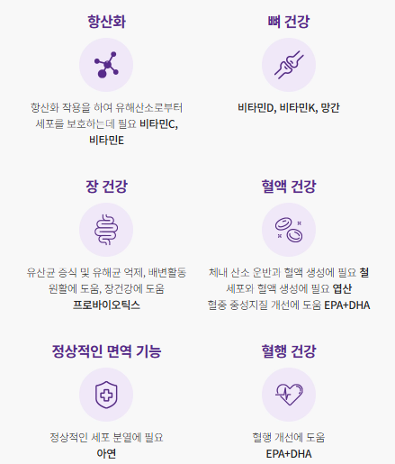 • 40~50대: 갱년기 건강을 위한 이소플라본, 뼈 건강을 위한 칼슘&비타민 D, 혈행 개선에 도움을 주는 오메가-3가 중요해지는 시기입니다.