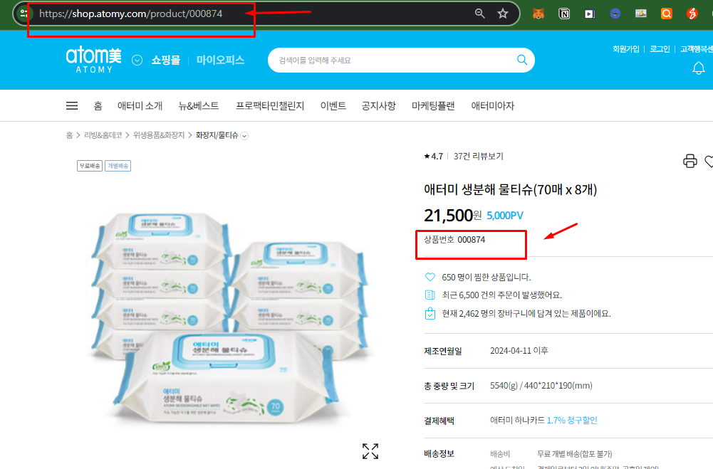 4. 3번에서 확인한 링크 주소나 상품번호를 khy4rang@gmail.com 또는 구글폼 작성으로 보내주시면 애터미 공식 쇼핑몰 간편 구매 내용 전달 드리겠습니다.
