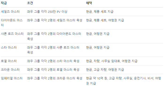 * 직급 달성 시 축하 프로모션으로 현금, 여행, 차량, 사무실 임대료 등이 지급됩니다. 예를 들어, 임페리얼 마스터 달성 시 약 10억 원의 현금과 다양한 혜택이 제공됩니다.