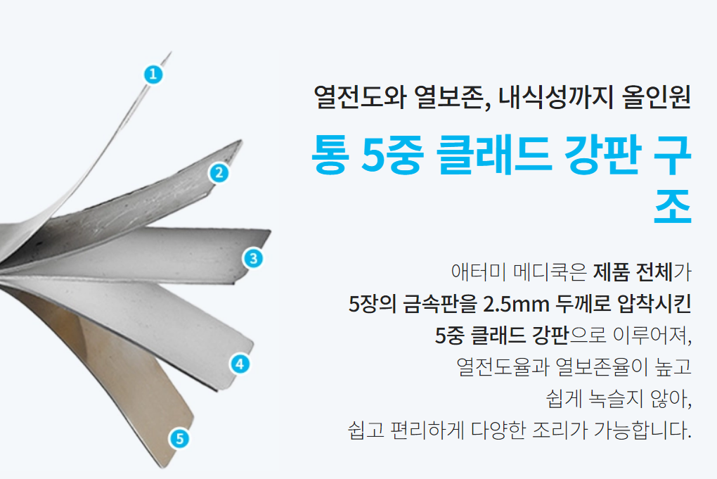 5장의 금속판을 압착하여 열전도율과 열보존율을 극대화했습니다.