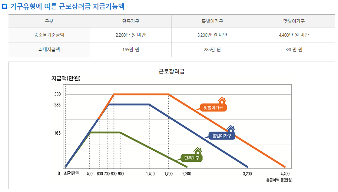 근로장려금 지급액은 가구 유형과 소득 수준에 따라 달라집니다: